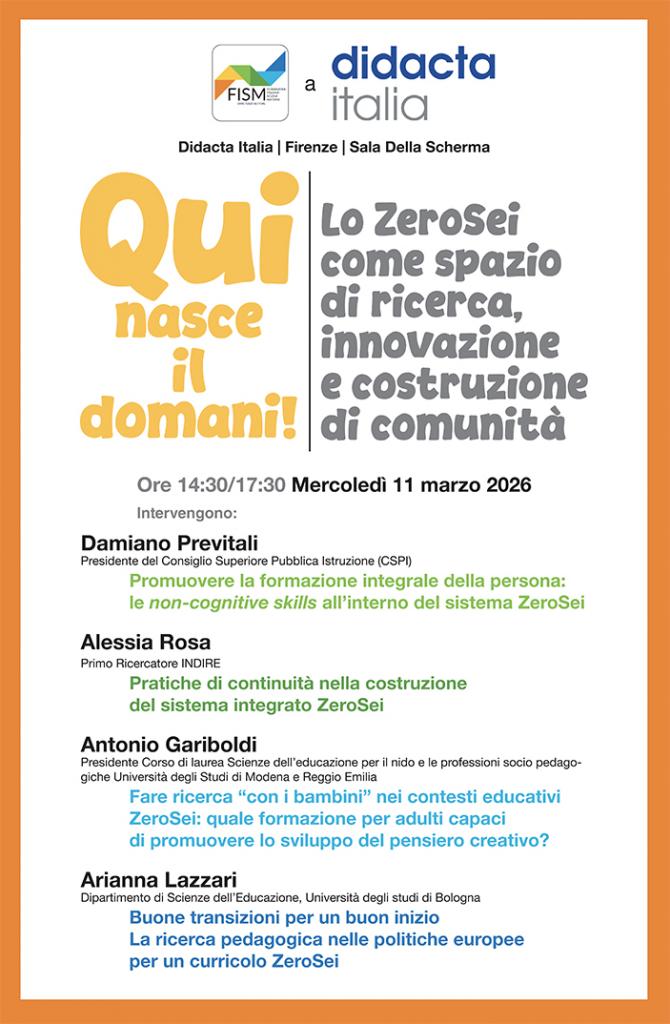 Dopo i saluti dei rappresentanti FISM, interverranno Damiano Previtali, presidente del Consiglio Superiore Pubblica Istruzione - CSPI (“Promuovere la formazione integrale della persona: le non-cognitive skills all’interno del sistema ZeroSei”); Alessia Rosa, Primo Ricercatore INDIRE (“Pratiche di continuità nella costruzione del sistema integrato ZeroSei”); Antonio Gariboldi, Presidente Corso di laurea Scienze dell’educazione per il nido e le professioni socio pedagogiche Università degli Studi di Modena e Reggio Emilia (“Fare ricerca ‘con i bambini’ nei contesti educativi ZeroSei: quale formazione per adulti capaci di promuovere lo sviluppo del pensiero creativo?”); Arianna Lazzari, Dipartimento di Scienze dell’Educazione, Università degli studi di Bologna (“Buone transizioni per un buon inizio. La ricerca pedagogica nelle politiche europee per un curricolo ZeroSei”).