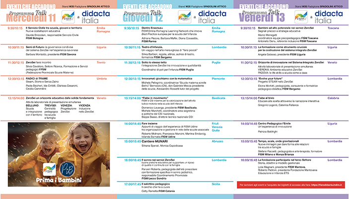 Oltre a questo evento “in plenaria”, che vedrà la presenza di delegati della Federazione da tutte le sedi regionali e provinciali, sono ben ventidue – presso lo Stand W20 nel Padiglione SPADOLINI ATTICO – i talk organizzati da FISM a DIDACTA.